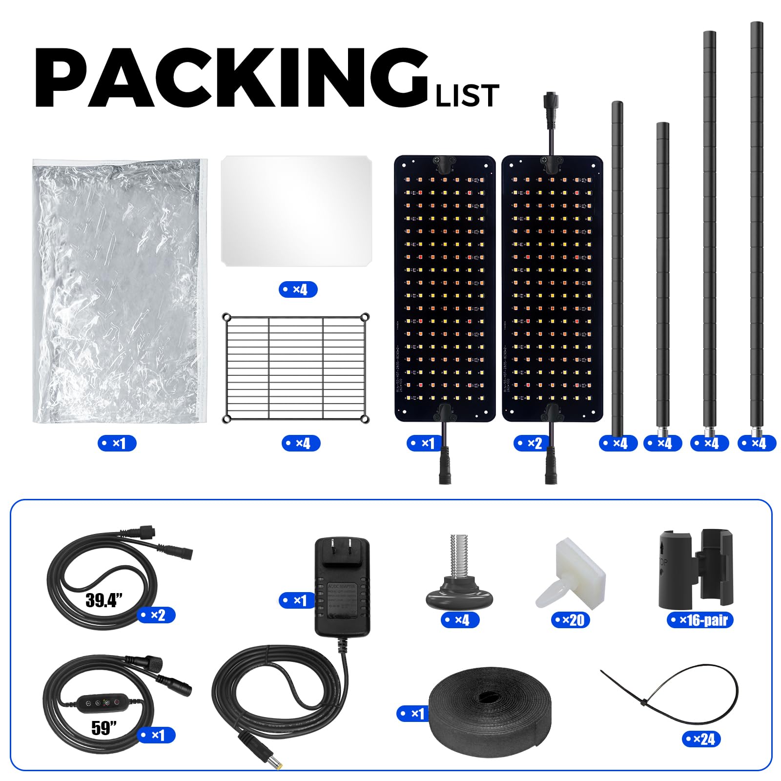 - What You Get: 4 x Barrina Grow Light Panel, 1 x AC/DC Adaptor, 1 x Power Cord with Turn On/Off Timer, 3 x Connecting Cord, 1 x Hook and Loop Tape, 20 x Snap-in Adhesive, 20 x Cable Tie, 5 x wire shelf, 5 x PP pad, 1 x Accessory Kit for Plant Shelf, 1 x Installation Manual