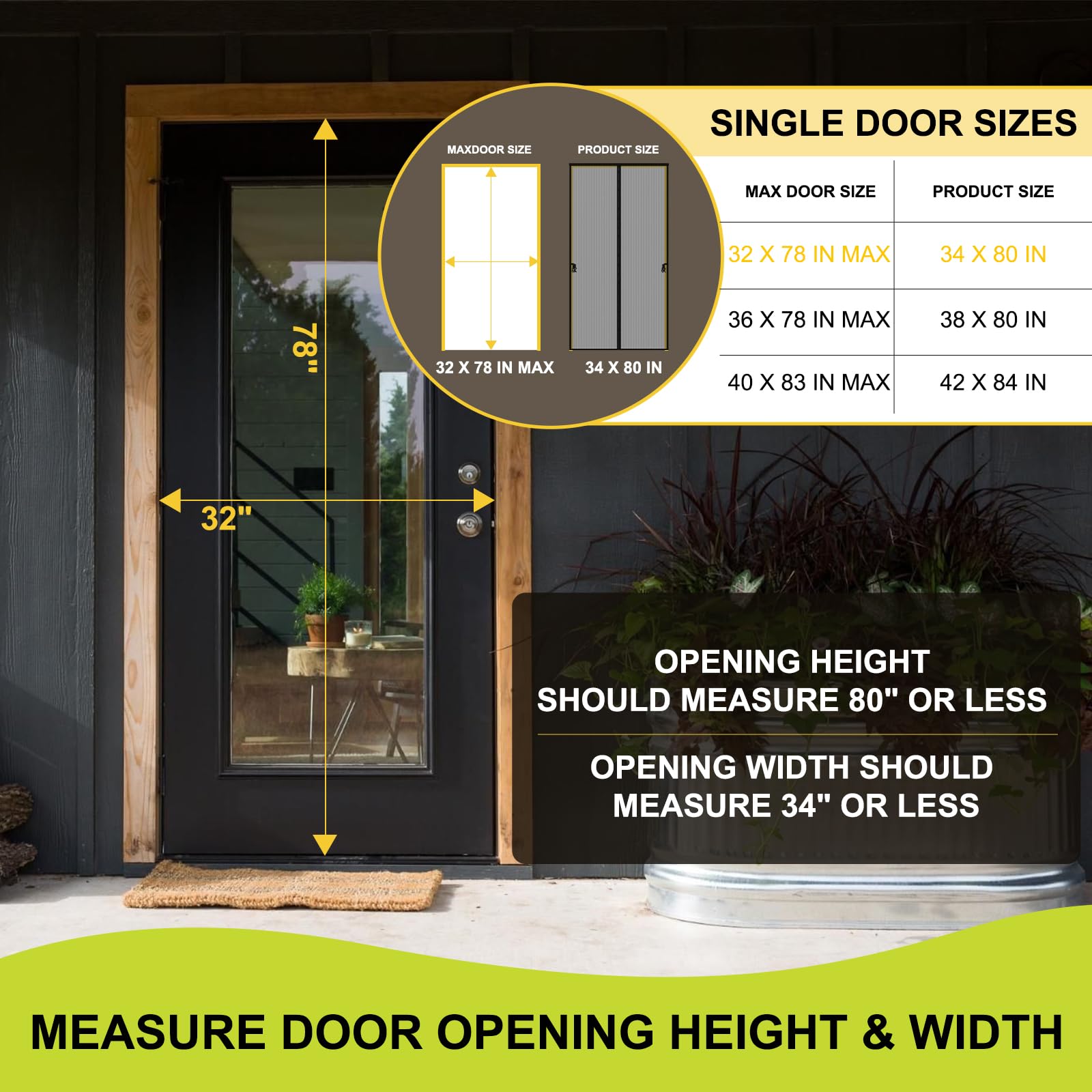 - 【Fits Door Sizes 32"x80"】 The SIZE 32x80" label on the inner fabric of the magnetic screen door means it is Fit for 32x80 inch doors. Screen Door Actual Measurement is Width 34" Height 82".Versatile application for various doorways, including front doors, patio doors, and sliding doors. Fits for homes, offices, and even recreational vehicles (RVs) .